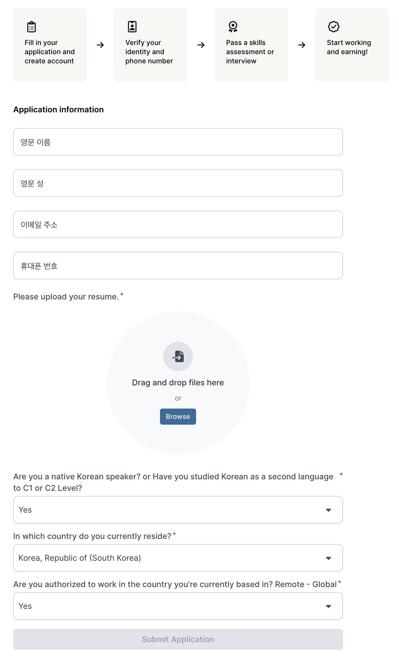 마지막으로 Submit Application(지원서 제출) 버튼을 클릭합니다. 지원서를 제출한 후에는 Outlier 팀의 검토 과정을 거치게 됩니다. 서류가 통과되면 입력하신 메일로 간단한 작문 테스트 링크가 발송됩니다. 누구나 쉽게 답변 가능한 내용들입니다. 통과가 되면 한국어로 인터뷰가 진행됩니다. 실시간 영상 인터뷰가 아닌, 인터뷰 영상을 녹화해서 업로드하면 되니 어렵지는 않습니다.