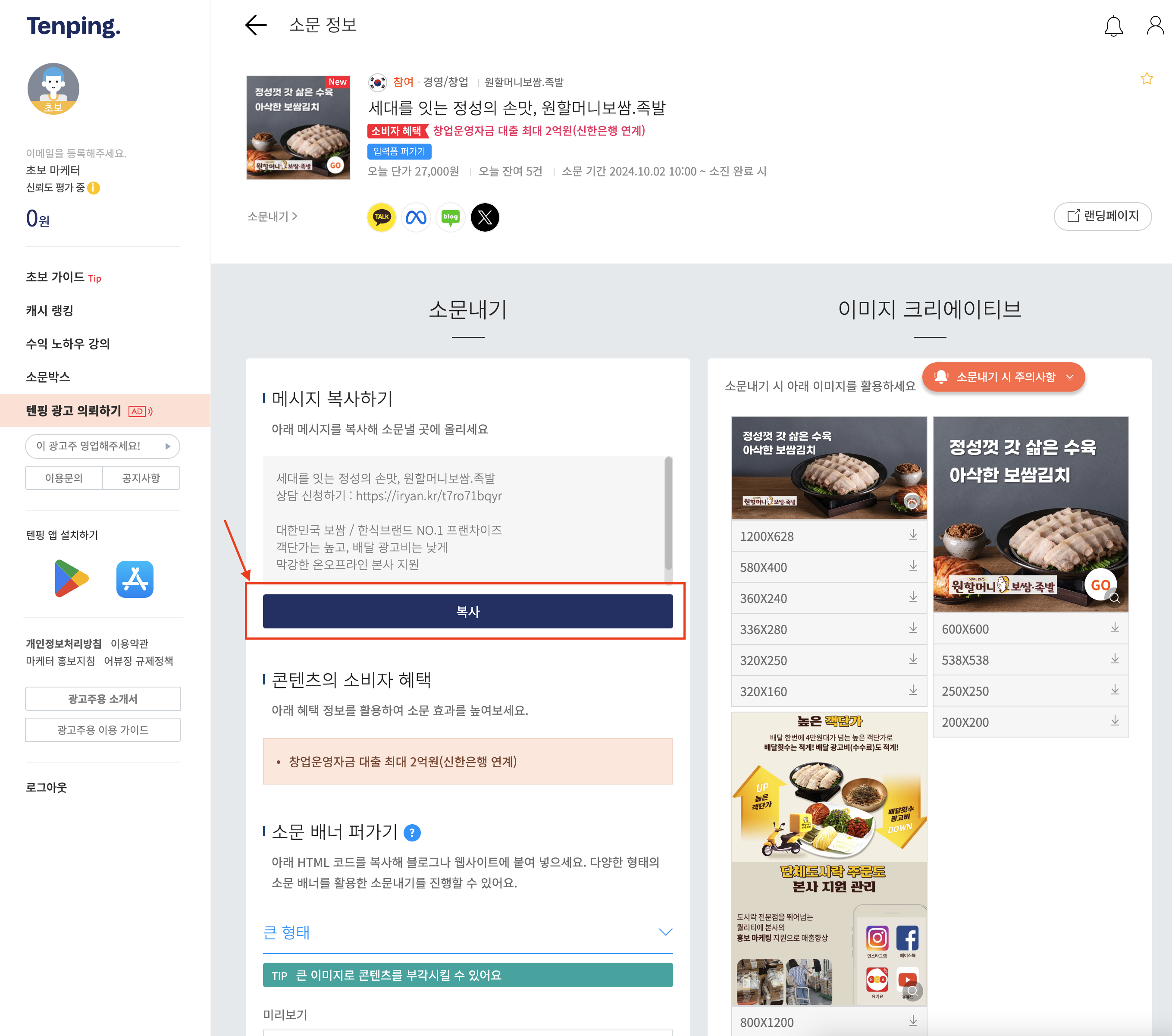 광고 상세 화면에 '메시지 복사하기' 영역에 [복사] 버튼을 클릭하면, 나만의 이 광고를 홍보하기 위한 링크를 복사할 수 있습니다.