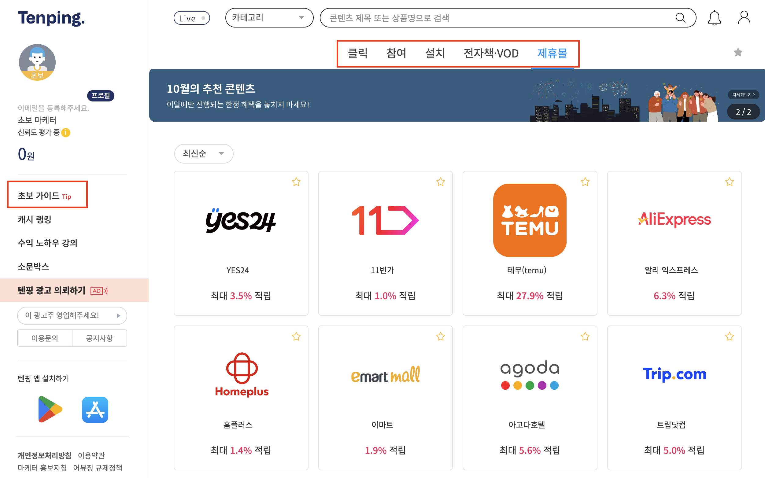 - 구매형(전자책·VOD/제휴몰(CPS, Cost Per Sale)): 텐핑과 제휴된 쇼핑몰에서 제품을 구매 후 확정 시 수익 발생