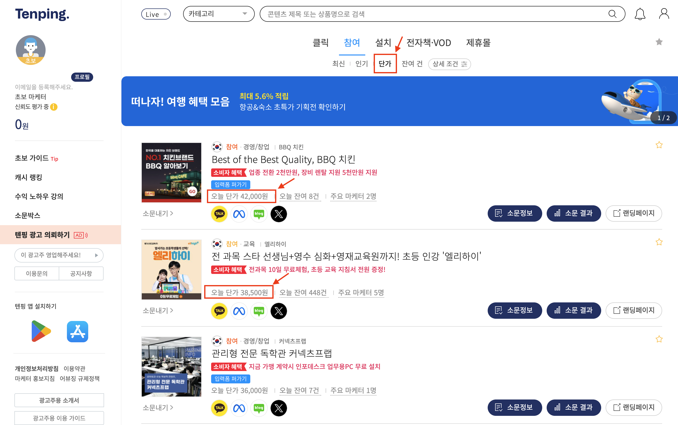 참여형을 예시로 나만의 홍보 링크를 확인하는 방법을 알려드리면, 우선 참고하고 싶은 단가가 높은 광고를 클릭합니다.