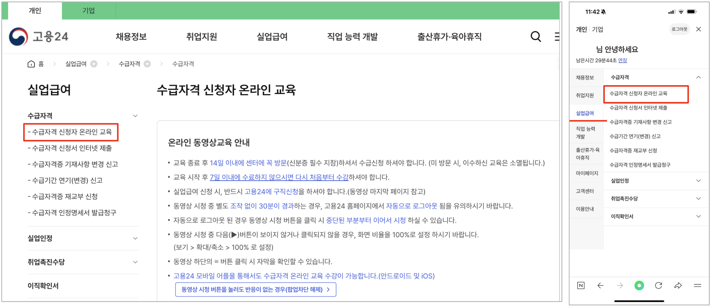 고용24: PC, 모바일 수급자격 신청자 온라인 교육