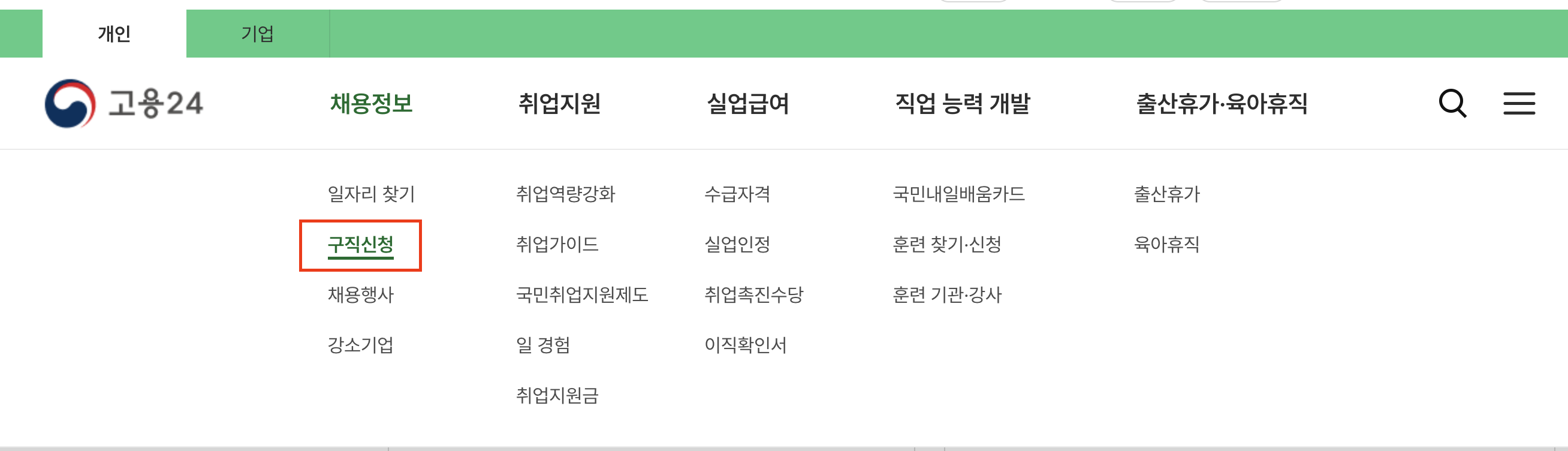 모바일: 고용24 > 채용정보 > 구직신청