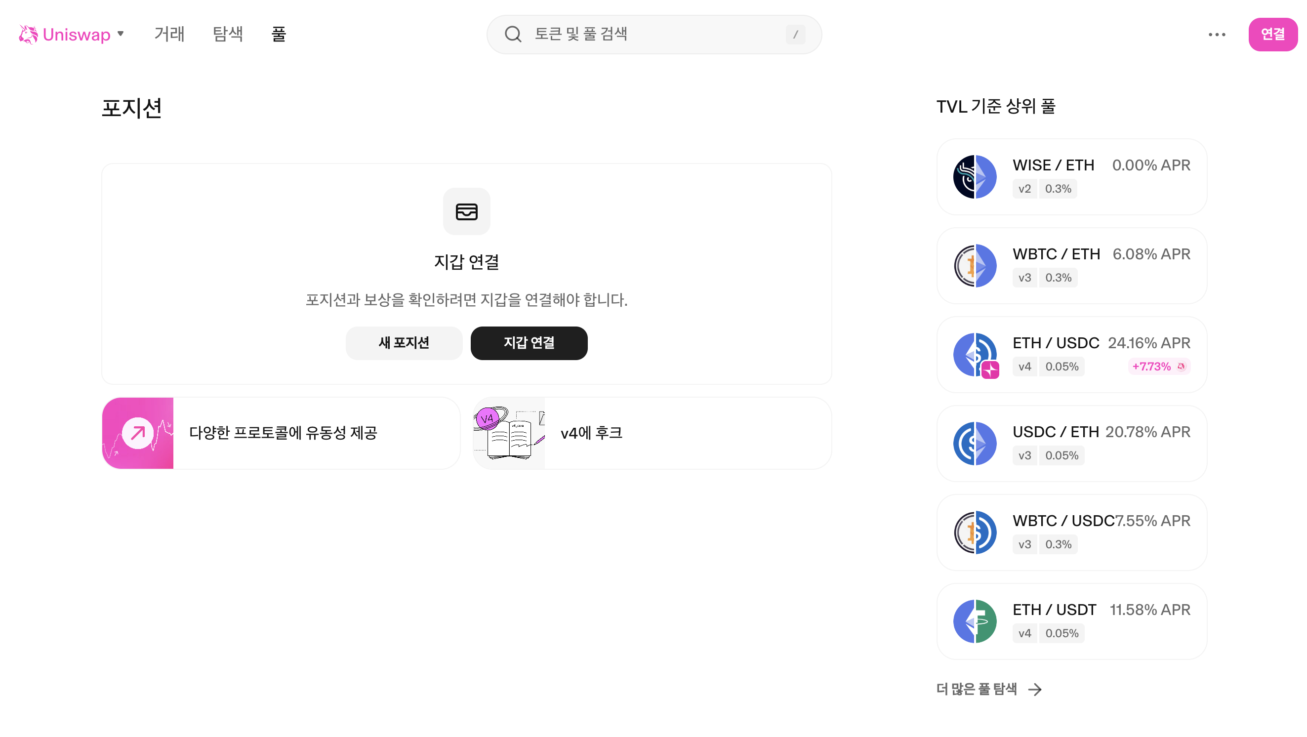 - https://app.uniswap.org/#/pool로 이동해 지갑을 연결합니다.