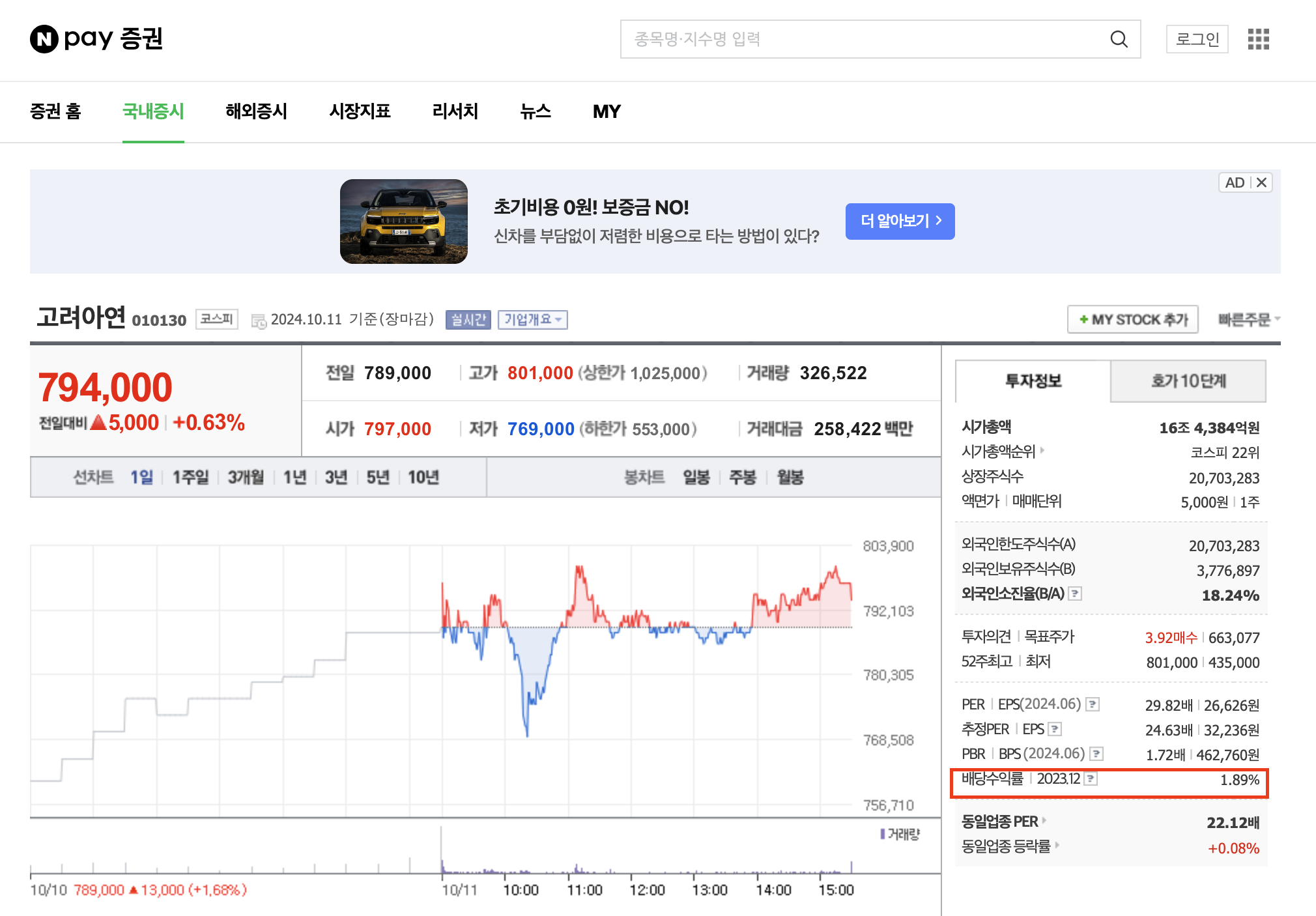 1) 고려아연 (code: 010130 / 주식 시세 조회)