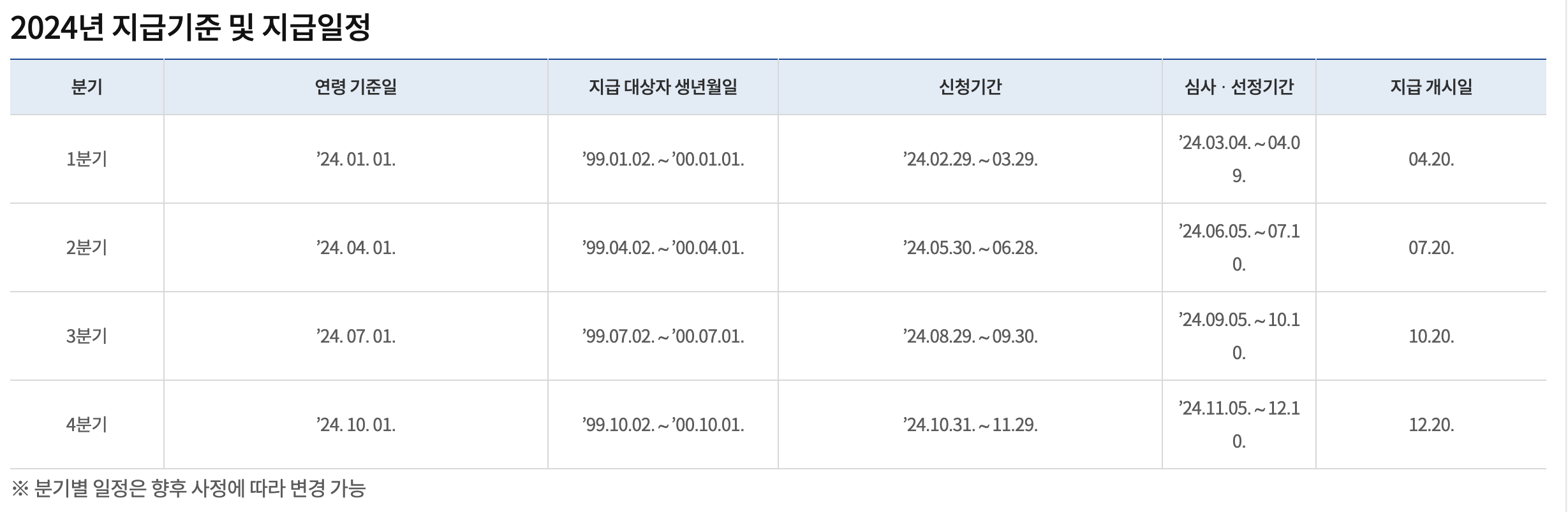 청년기본소득은 분기별로 지급됩니다. 2024년의 구체적인 지급 일정은 다음과 같습니다.