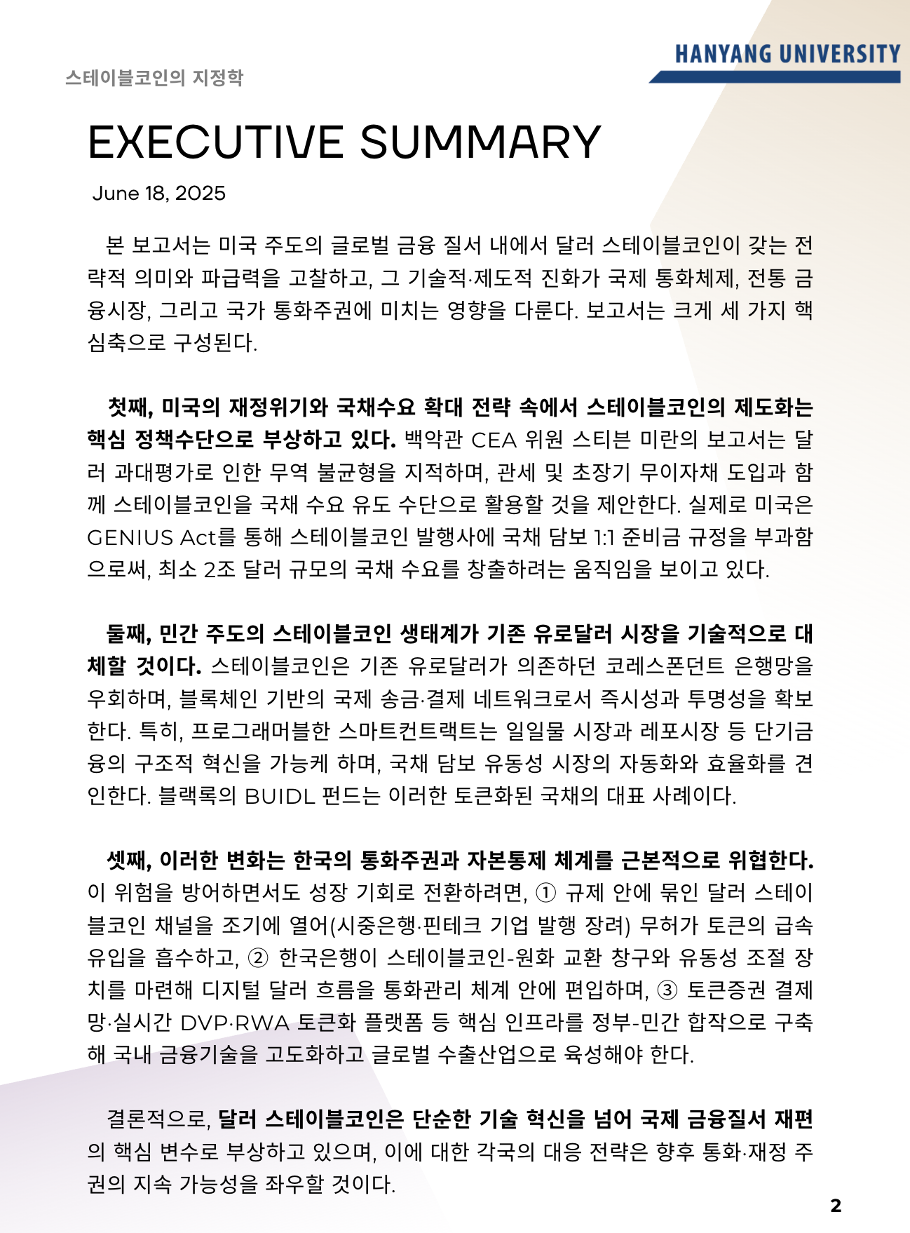 - 결론: 스테이블코인은 피할 수 없는 흐름이며, 기회와 위기가 공존한다는 점을 인지하고, 원화 스테이블코인 도입·활용 전략과 통화주권 수호를 위한 실질적 대책이 필요함.